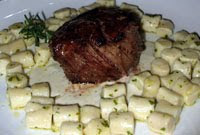Já para o prato principal, experimentei o Bombom de Mignon (foto), que promete ser um dos carros-chefes do novo cardápio. Trata-se de um tornedor de filé em cama de gorgonzola com nhoque na manteiga de rúcula e flocos crocantes. A sommelier indica para acompanhar o Finca El Portillo Chardonnay. Porém, fiquei com o seguinte tinto: