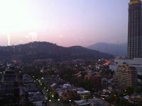 À noite, partimos para o Giratorio, no bairro da Providencia. É um clássico de Santiago, sempre indicado para os turistas. Fica no topo de um prédio, de onde temos uma visão de 360 graus da cidade. A grande sensação, como já diz o seu nome, é que o salão gira vagarosamente. Enquanto comemos e bebericamos, temos sempre uma vista diferente de Santiago. A decoração é meio antiquada, tipo anos 80. A comida é razoável, assim como a carta de vinhos. Por falar em vinhos, lá provamos um Santa Rita Medalla Real Reserva Carmenère 2009 e um Casa Rivas Gran Reserva Carmenère 2008. O primeiro bom e o segundo excelente.