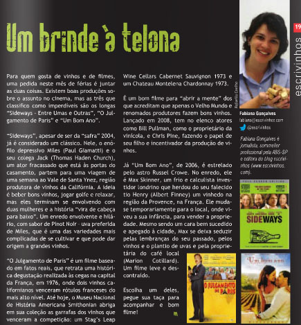 O texto da minha coluna deste mês da revista Mon Quartier fala de três filmes sobre vinhos para você curtir nas férias. Confira: