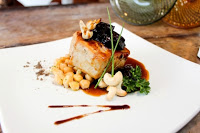 Dois pratos principais foram servidos com o vinho argentino, da patagônia, Bodega Del Fin do Mundo Reserva Viognier 2010: a Tilápia com recheio de tomates, ervas e azeitonas pretas ao beurryblanc com arroz de castanhas; e o Lombo de Leitão com ameixas e castanhas, feijão branco ao alho poró (foto) – uma carne com pouca intensidade e muito sabor.