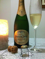 Para começar os trabalhos, um Champagne. Esse não estava guardado há muito tempo, pois havia trazido de viagem recente à França. Era um rótulo que eu tinha muita curiosidade em provar, uma vez que a marca possui o título de grife mais exclusiva de champanhe do mundo. Em meados do século XIX, a Perrier Jouët se tornou a fornecedora oficial de champagnes para a rainha Vitória, da Inglaterra.