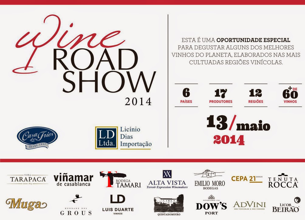 A Licínio Dias (LD) Importação traz de volta ao Recife o Wine Road Show, em parceria com a Épice Importação. Este ano, o evento vai reunir 17 vinícolas de diferentes partes do mundo, que trarão cerca de 60 diferentes vinhos para serem degustados pelo público presente, apresentados pessoalmente pelos próprios produtores. O Wine Road Show 2014 acontecerá no piso superior da Casa dos Frios, no bairro das Graças, no dia 13 de maio (terça-feira), das 18h às 22h. A entrada individual custa R$ 80, dos quais R$ 40 poderão ser revertidos em compras de vinhos provados durante o evento.