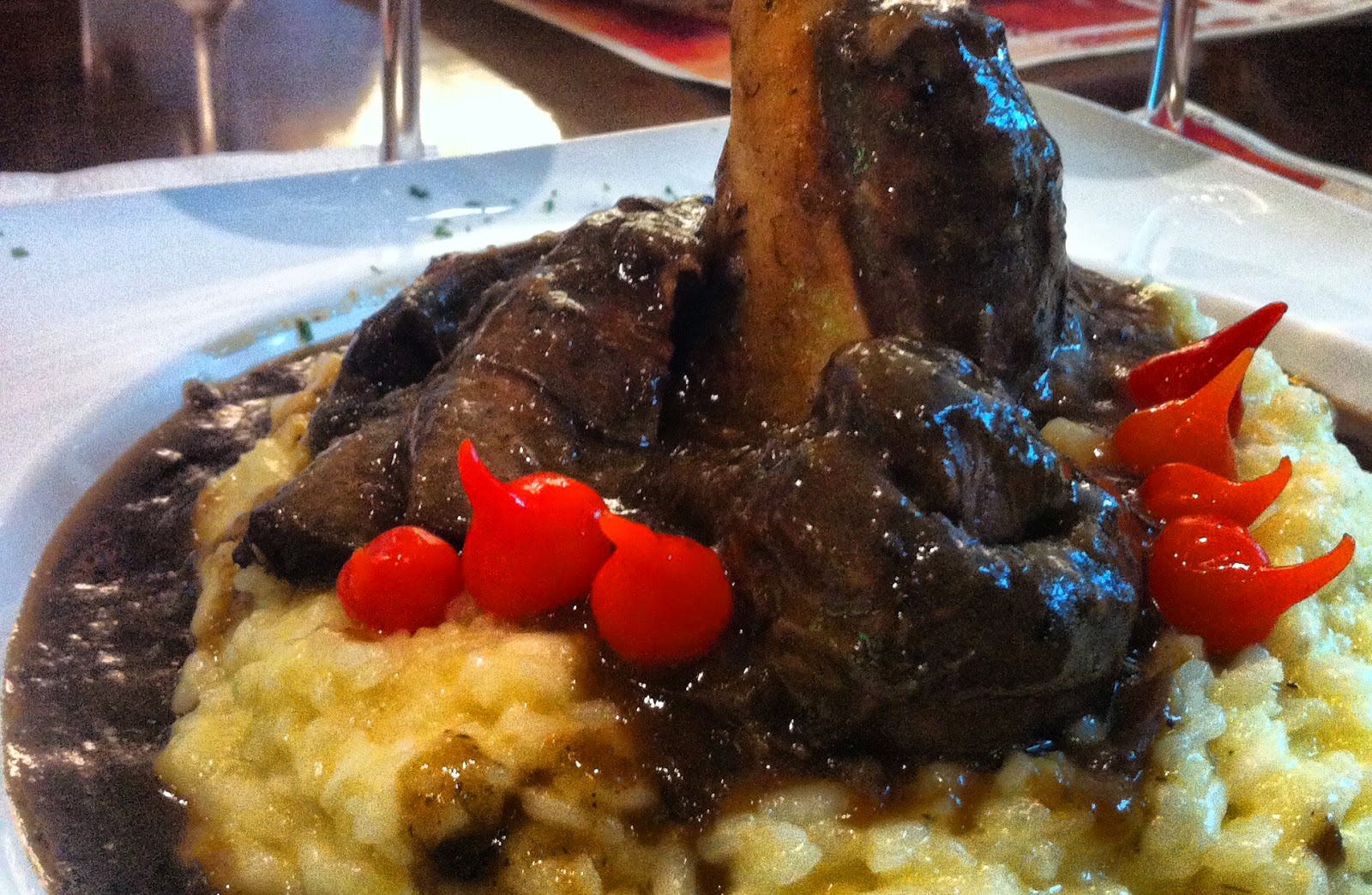 d’agnello (foto abaixo). Uma mini perna de cordeiro cozida no próprio molho, onde é marinado