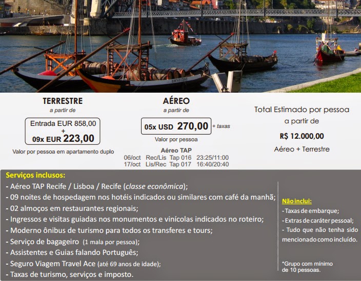 A agência de turismo pernambucana Luck Viagens, em parceria com a Licínio Dias (LD) Importação, está oferecendo um roteiro para Portugal com foco em cultura, vinho e gastronomia. A viagem acontece de 08 a 17/10/2014 e inclui visitas a importantes vinícolas, tais como Herdade do Esporão, Raposeira, Caves Aliança, Quinta do Crasto e Ramos Pinto.