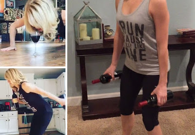 Embora eu seja uma grande apreciadora de vinhos, acho totalmente louca a ideia de se consumir a bebida durante os exercícios físicos. Porém, uma jovem norte-americana de 24 anos, chamada April Storey, resolveu chamar a atenção do público com vídeos na internet onde aparece malhando e dando uns goles na taça.